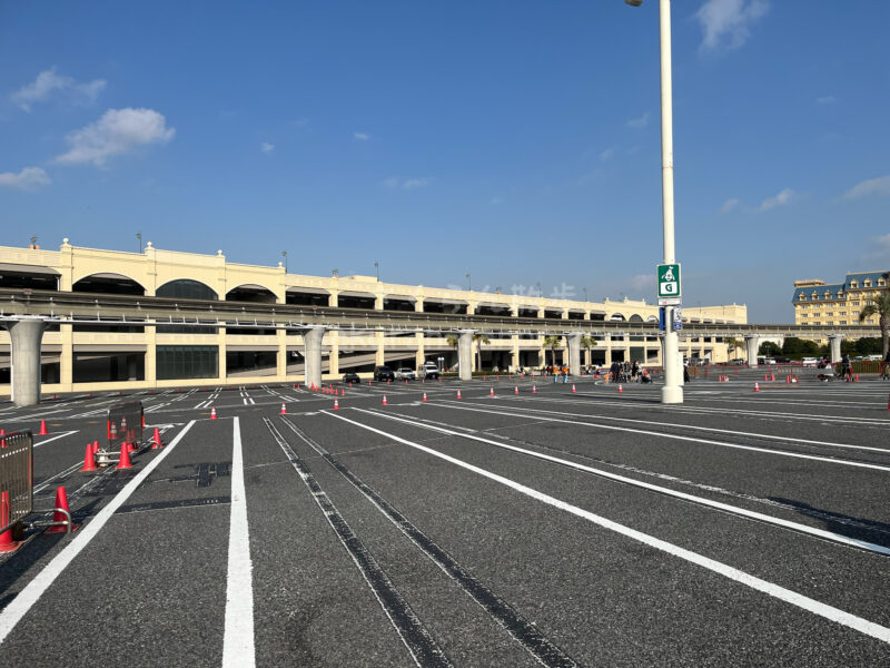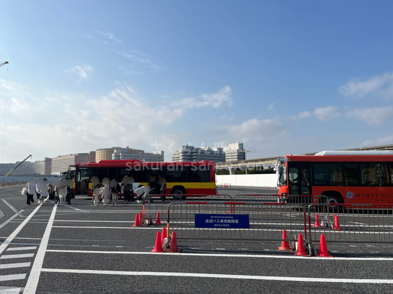 ディズニーランドは、駐車場内に設置された「送迎バス専用乗降場」の青い看板が目印。